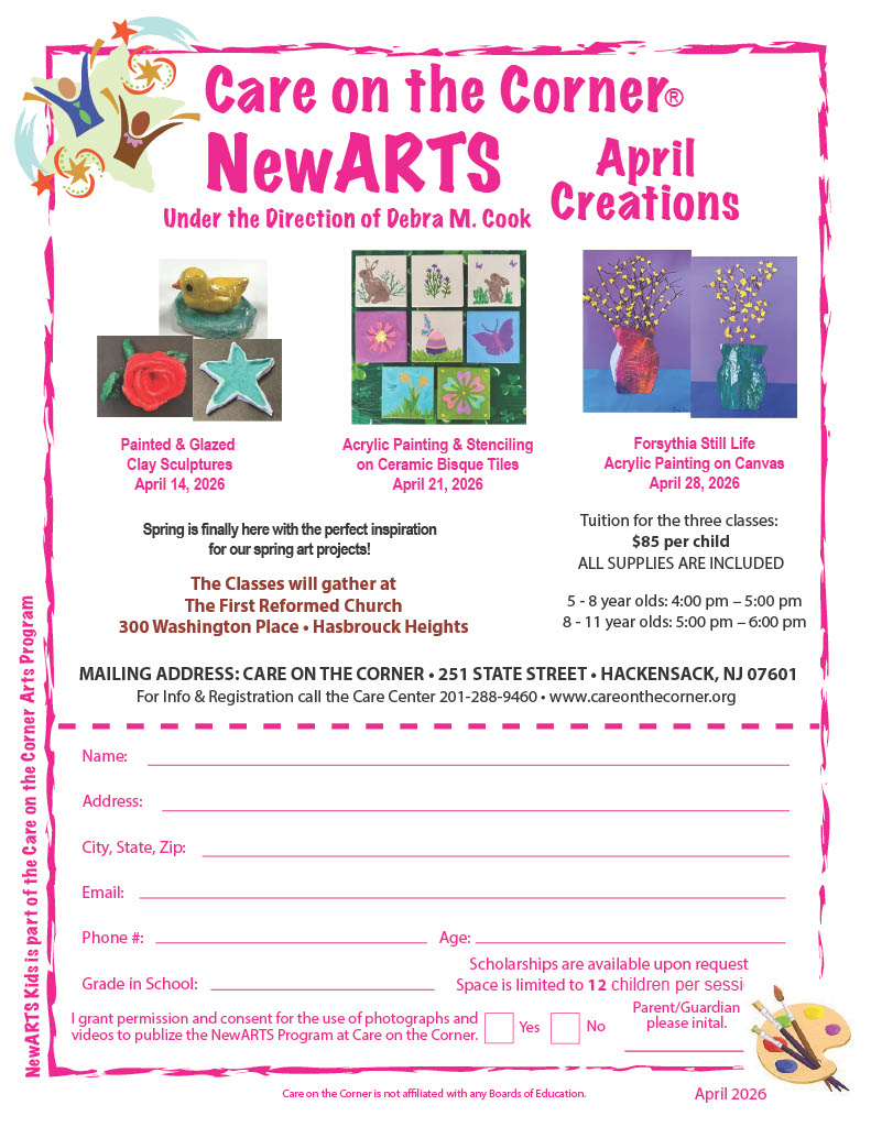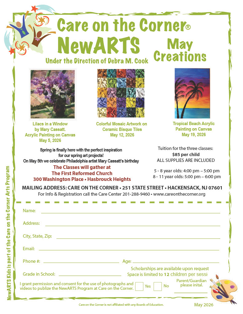 Care on the Corner is a 501 (c) (3) non- for-profit, whose mission is to help enrich the lives of the people of Northern New Jersey. Through educational programs and the exploration of the arts, it provides opportunities to increase their awareness, creativity and confidence, using a balanced approach to knowledge and visual and performing arts experiences. These efforts aim to inspire families to believe in their ability to accomplish whatever goals they set for themselves.